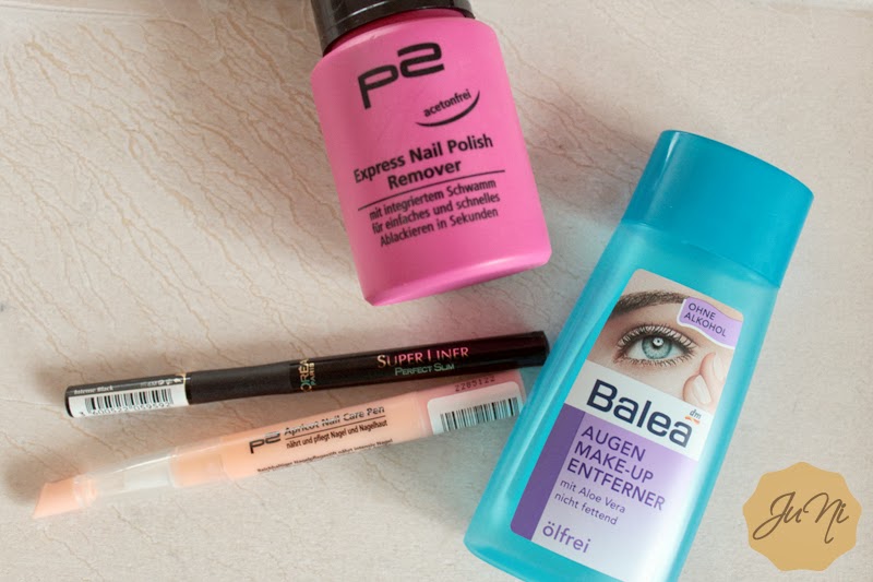 Der "Apricot Nail Care Pen" von p2 riecht nicht nur lecker, sondern sorgt auch für weiche und gepflegte Nagelhaut - wird nachgekauft.Bereits neu angeschafft ist der "Super Liner Perfekt Slim" von L'Oreal Paris - der bisher beste Eyeliner den ich hatte!Der "Express Nail Polish Remover" von p2 ist ebenfalls schon mehrmals nachgekauft und mittlerweile unverzichtbar beim Nägelablackieren.Der Augenmakeup-Entferner von Balea war nicht so arg meins, da er nicht gründlich genug gereinigt hat, schade.