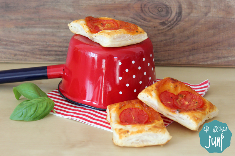 Zutaten:1 Rolle Blätterteigrotes Pesto12 - 16 Cherrytomaten, in Scheiben geschnittenPfefferAuch die Zubereitung ist denkbar einfach:Blätterteig ausrollen, in 12 oder 16 Stücke schneiden. Jedes Stück mit etwas Pesto bestreichen. Jeweils mit ein paar Tomatenscheiben belegen und pfeffern.Im vorgeheizten Backofen bei rund 180°C ca. 20 - 25 Minuten goldbraun backen.
