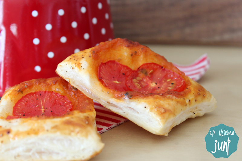 Zutaten:1 Rolle Blätterteigrotes Pesto12 - 16 Cherrytomaten, in Scheiben geschnittenPfefferAuch die Zubereitung ist denkbar einfach:Blätterteig ausrollen, in 12 oder 16 Stücke schneiden. Jedes Stück mit etwas Pesto bestreichen. Jeweils mit ein paar Tomatenscheiben belegen und pfeffern.Im vorgeheizten Backofen bei rund 180°C ca. 20 - 25 Minuten goldbraun backen. Schmeckt auch als "Hauptgericht" zu einem bunten Salat sehr lecker! Oder als Beilage zu einer Suppe. Oder einfach nur so zwischendurch.Oder, oder, oder...