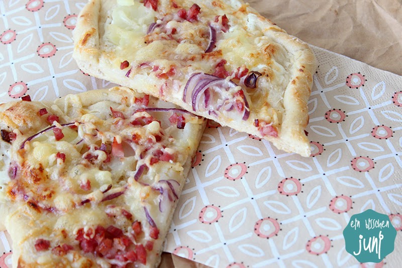 Dinnede habe ich zum ersten Mal selbst gemacht, gegessen hatte ich es schon mehrere Male. Meistens wenn Ju und ich Messe haben. Dort gibt es nämlich einen Stand (ganz in der Nähe unseres Messebüros^^) mit Dinnede aus dem Holzofen.Gefunden habe ich das Rezept bei Anita von "Olles Himmelsglitzerdings" - danke, liebe Anita, für das tolle Rezept und die Anregung :)Zutaten:1/2 Würfel Hefe300 ml Wasser, warm500 g Mehl2 TL Salz1 TL getrocknete Kräuter4 EL Schmand oder Saure SahneSalz, Pfeffer 1-2 rote Zwiebel400 g gekochte und geschälte Kartoffeln100 g geriebener Käse100g Speckwürfel Zubereitung:Hefe in eine Schüssel bröseln und in dem Wasser auflösen.