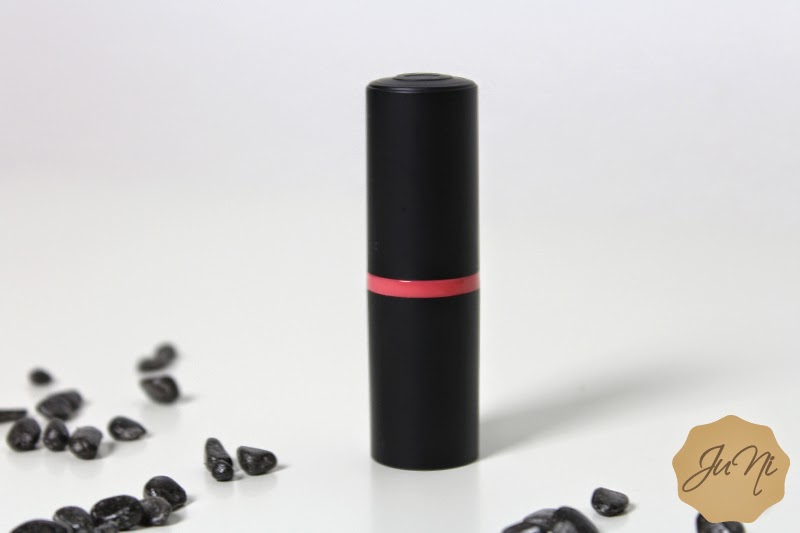 Das Design des Lippenstiftes ist ziemlich schlicht. Eine schwarze, matte Hülle umgibt den Kern. Mittig ist ein farbiger Streifen in der jeweiligen Farbnuance angebracht. Das gefällt mir gut, diese schlichte Eleganz. Der untere Bereich ist mit der typischen Farbbezeichnung versehen, der obere Bereich am Deckel mit einer "e"-Prägung. Das Öffnen und Schließen funktioniert gut und die allgemeine Verarbeitung ist für den Preis hochwertig.