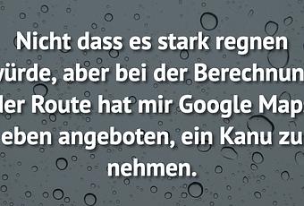 Auf Facebook teilen Vorige Folgende Nicht dass es stark regnen würde, aber bei der... Autor des Artikels : istdaslustig Zum Original-Artikel Nicht dass es stark regnen würde, aber bei der Berechnung der Route hat mir Google Maps eben angeboten, ein Kanu zu nehmen. Hier geht es zum Artikel Mehr Lustiges auf www.istdaslustig.de Auf Facebook teilen Vorige Folgende Das könnte Ihnen gefallen Mehr