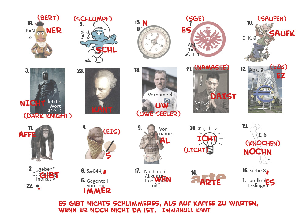 Eine Menge Hirnschmalz musste in die zweite Runde des NKFOM BlogQuiz™ #2 investiert werden, denn das diesjährige Rebusrätsel hatte es in sich. Uwe Seeler und ein Schlumpf, arte und die Eurpäische Zentralbank. Eine wilde Mischung an Bildchen und Wörtern, die nach richtigem Rätseln und Sortieren ein Zitat ergeben sollten. Der Zitierte verbarg sich hinter dem Bild mit der Nummer 23 und ist niemand Geringeres als Immanuel Kant. Sein Ausspruch befasst sich mit Georges Lieblingsgetränk - dem Kaffee - und lautet: