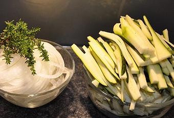 Bevor endgütlig der Kürbis in der Küche Einzug hält, kommt nochmals ein leckeren Zucchini-Rezept. Gelernt habe ich bei diesem Rezept, dass man die dünnen Gemüsestreifen "Julienne" nennt. Um die Zucchini-Julienne herzustellen schneidet man die Enden der Zucchini ab. Die Früchte werden der Länge nach in etwa 5 cm lange und etwa 1/2 cm dicke Scheiben geschnitten. Dann 3 oder 4 Zucchinischeiben aufeinanderlegen und diese in möglichst dünne Streifen schneiden. Das Nudelgericht ist besonders kalorienarm (kein Käse und keine Sahne) und schmeckt fruchtig aromatisch.