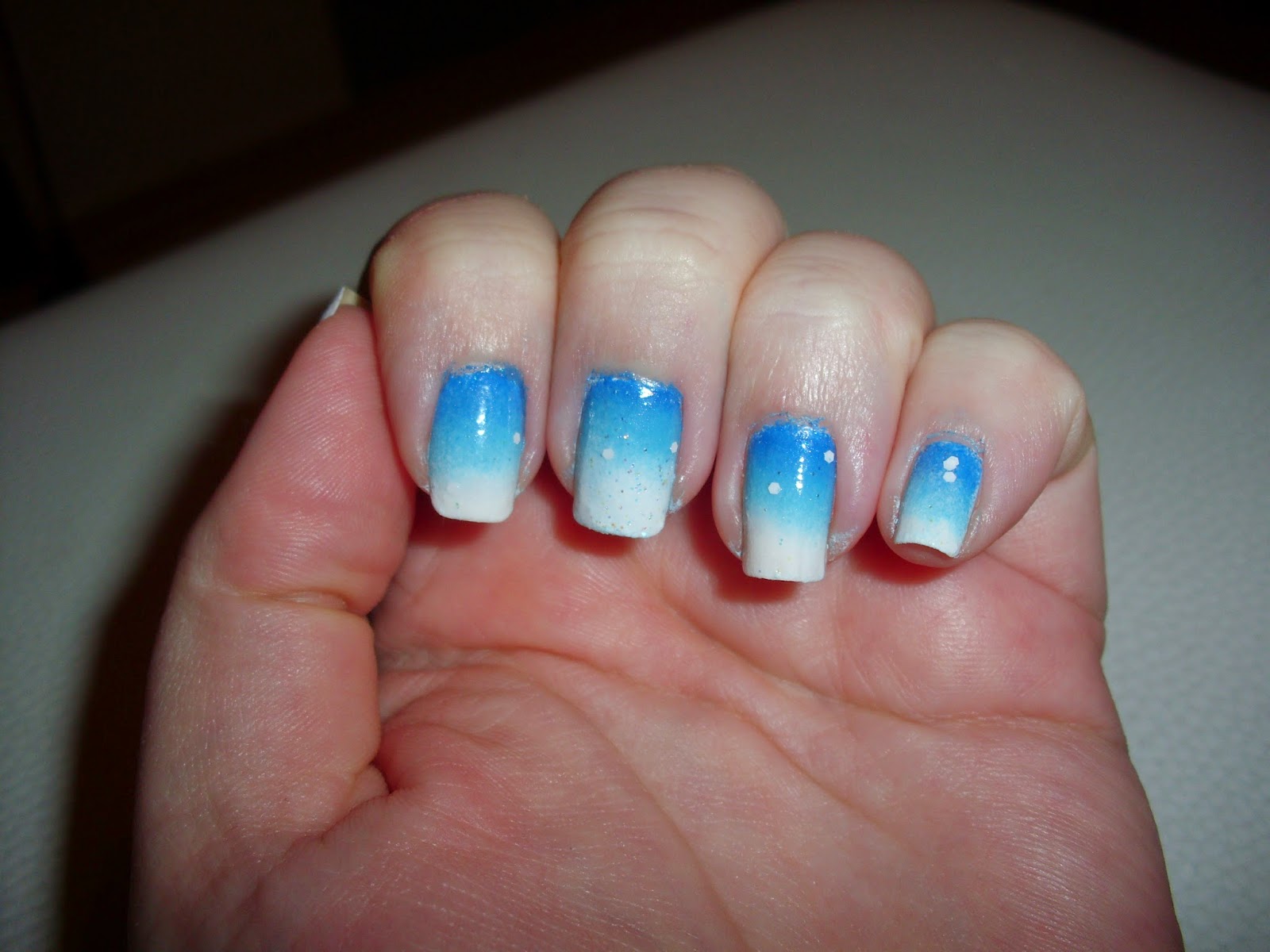 Ich habe als erstes einen Ombre Look getupft mit Weiß und zwei Blautönen. Dazu benutze ich immer ein Make up Schwämmchen. Nachdem das getrocknet war, habe ich noch einen Topcoat mit weißen Pünktchen aufgetragen.