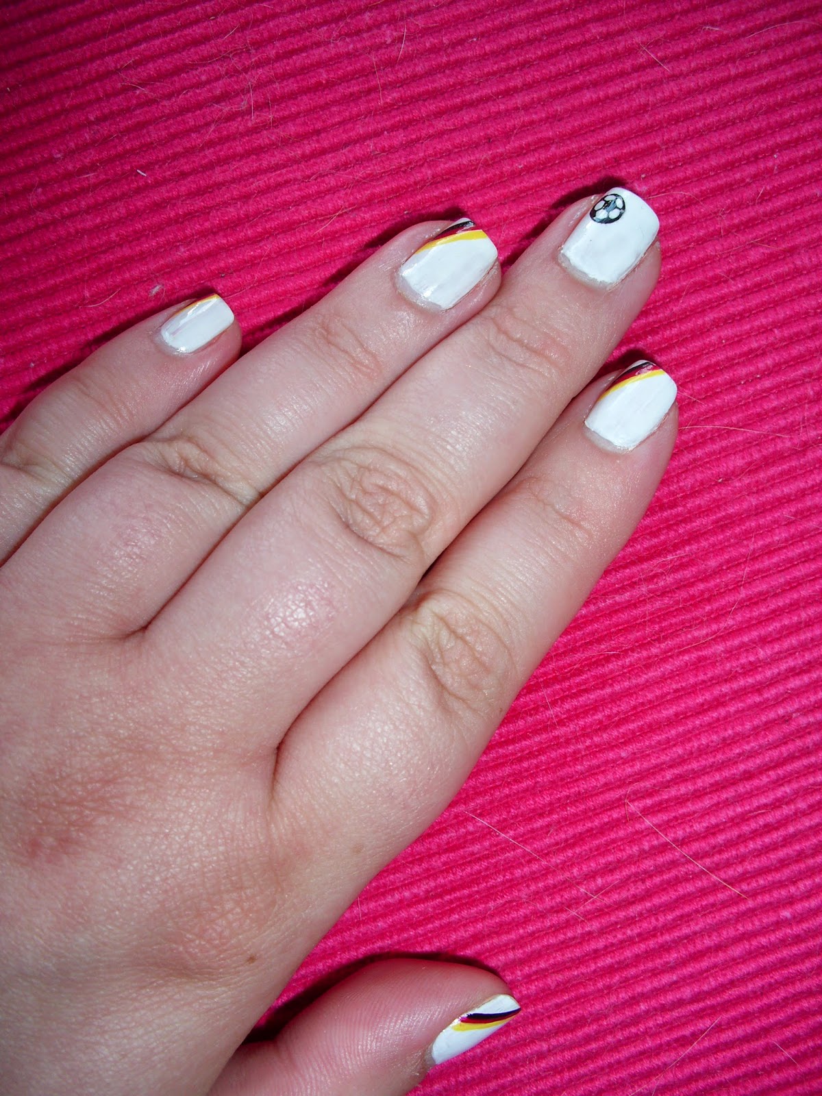 Auf dem Mittelfinger ein Ball-Sticker und auf den restlichen unsere Deutschlandfarben.