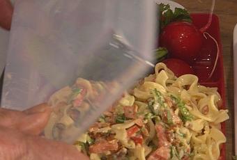 Nudeln, Tomaten, restliche Zwiebel mit dem Grün und fein geschnittenem Basilikum vermischen, dabei auch ein ganz wenig Salatsauce zugeben. Die restliche Sauce in einem Schraubglas mitnehmen und erst kurz vor dem Essen unter den Salat rühren.