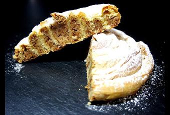 Nun die Nussmasse auf dem geölten Yufkateig kreisförmig verteilen.