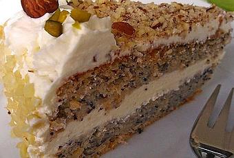 Den Zucker mit den Eigelben schaumig rühren, die Nüsse, Semmelbrösel und das Bittermandelöl zugeben. Die Eiweiße mit dem Zucker steif schlagen, unter die Eigelbmasse heben und in die Form füllen. (Vorsicht: Der Teig ist sehr ergiebig, nicht zu viel in die Form füllen, da Überlaufgefahr)