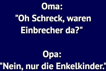 Auf Facebook teilen Vorige Folgende Oma: "Oh Schreck, waren Einbrecher da?" Opa:... Autor des Artikels : istdaslustig Zum Original-Artikel Oma: "Oh Schreck, waren Einbrecher da?" Opa: "Nein, nur die Enkelkinder." Hier geht es zum Artikel Mehr Lustiges auf www.istdaslustig.de Auf Facebook teilen Vorige Folgende Das könnte Ihnen gefallen Mehr
