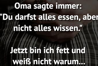 Auf Facebook teilen Vorige Folgende Oma sagte immer: "Du darfst alles essen, aber... Autor des Artikels : istdaslustig Zum Original-Artikel Oma sagte immer: "Du darfst alles essen, aber nicht alles wissen." Jetzt bin ich fett und weiß nicht warum... Hier geht es zum Artikel Mehr Lustiges auf www.istdaslustig.de Auf Facebook teilen Vorige Folgende Das könnte Ihnen gefallen Mehr