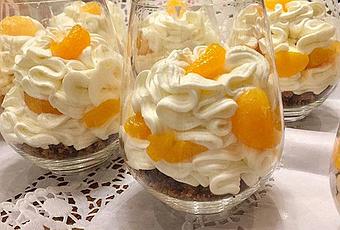 Die Kekse in eine Auflaufform bröseln, dann etwa die Hälfte der Mascarponecreme darauf verteilen. Nun die Mandarinen draufschichten. Die restliche Creme draufstreichen und mit dem Rest der Sahne bedecken.