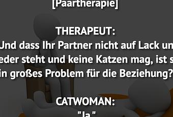 Auf Facebook teilen Vorige Folgende [Paartherapie] THERAPEUT: "Und dass Ihr... Autor des Artikels : istdaslustig Zum Original-Artikel [Paartherapie] THERAPEUT: "Und dass Ihr Partner nicht auf Lack und Leder steht und keine Katzen mag, ist so ein großes Problem für die Beziehung?" CATWOMAN: "Ja." Hier geht es zum Artikel Mehr Lustiges auf www.istdaslustig.de Auf Facebook teilen Vorige Folgende Das könnte Ihnen gefallen Mehr