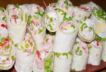 Die Tortilla Wraps jeweils mit dem Dressing bestreichen und mit Schinken, Käse, Salatblättern und Tomatenscheiben belegen. Alles zusammenrollen, in kleine Stücke schneiden und auf kleine Holzspieße stecken.