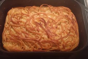 Die Brösel mit dem Käse mischen, über den Auflauf geben, Butter in Flocken draufgeben. Den Auflauf 40 Minuten auf der mittleren Schiene backen.