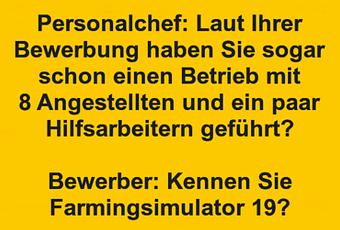 Auf Facebook teilen Vorige Folgende Personalchef: Laut Ihrer Bewerbung haben Sie... Autor des Artikels : istdaslustig Zum Original-Artikel Personalchef: Laut Ihrer Bewerbung haben Sie sogar schon einen Betrieb mit 8 Angestellten und ein paar Hilfsarbeitern geführt? Bewerber: Kennen Sie Farmingsimulator 19? Hier geht es zum Artikel Mehr Lustiges auf www.istdaslustig.de Auf Facebook teilen Vorige Folgende Das könnte Ihnen gefallen Mehr