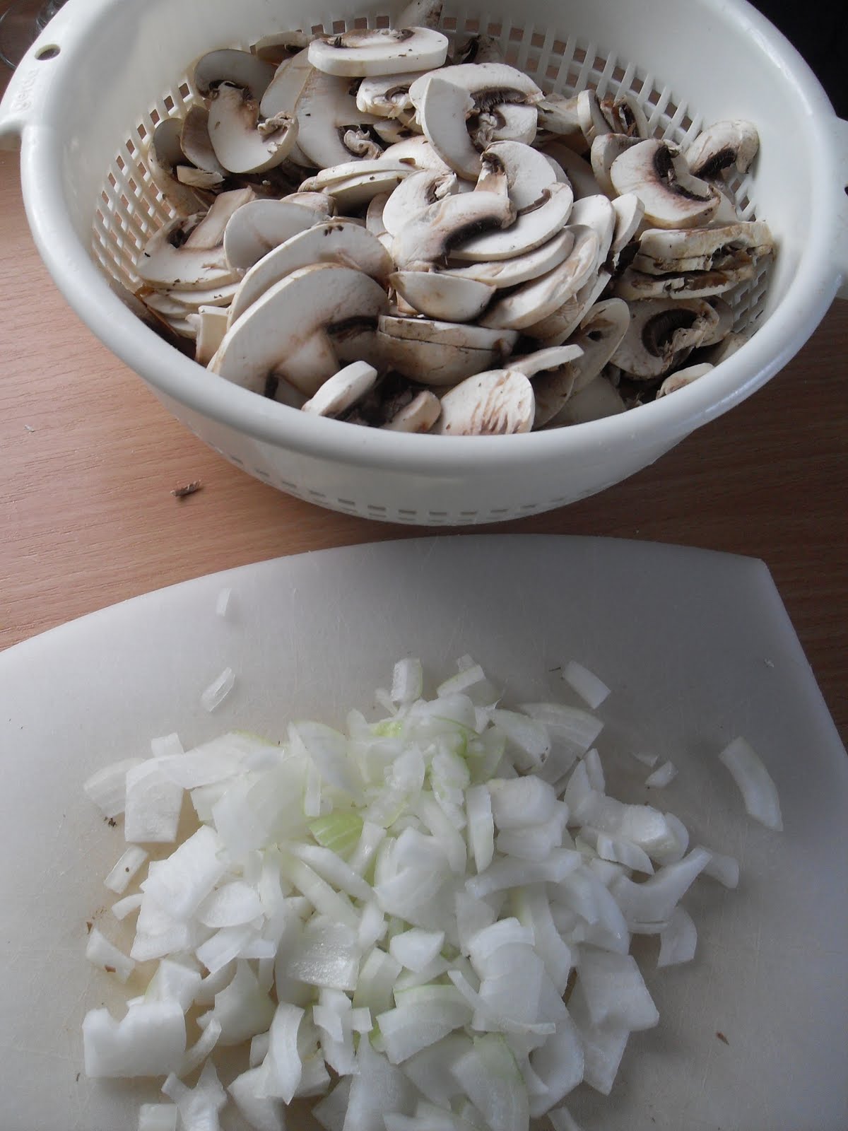 Zutaten:500 g Champignons1 ZwiebelSalz, schwarzer frisch gemahlener Pfeffer1 TL ÖlZubereitung:Die Champignons putzen, von den Stielen befreien und blättrig schneiden bzw. wenn man sehr kleine Champignons hat, kann man sie auch einfach nur vierteln.Die Zwiebel schälen und in feine Streifen/Würfelchen schneiden.