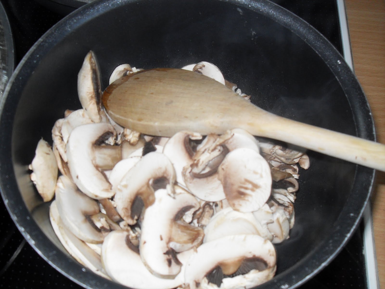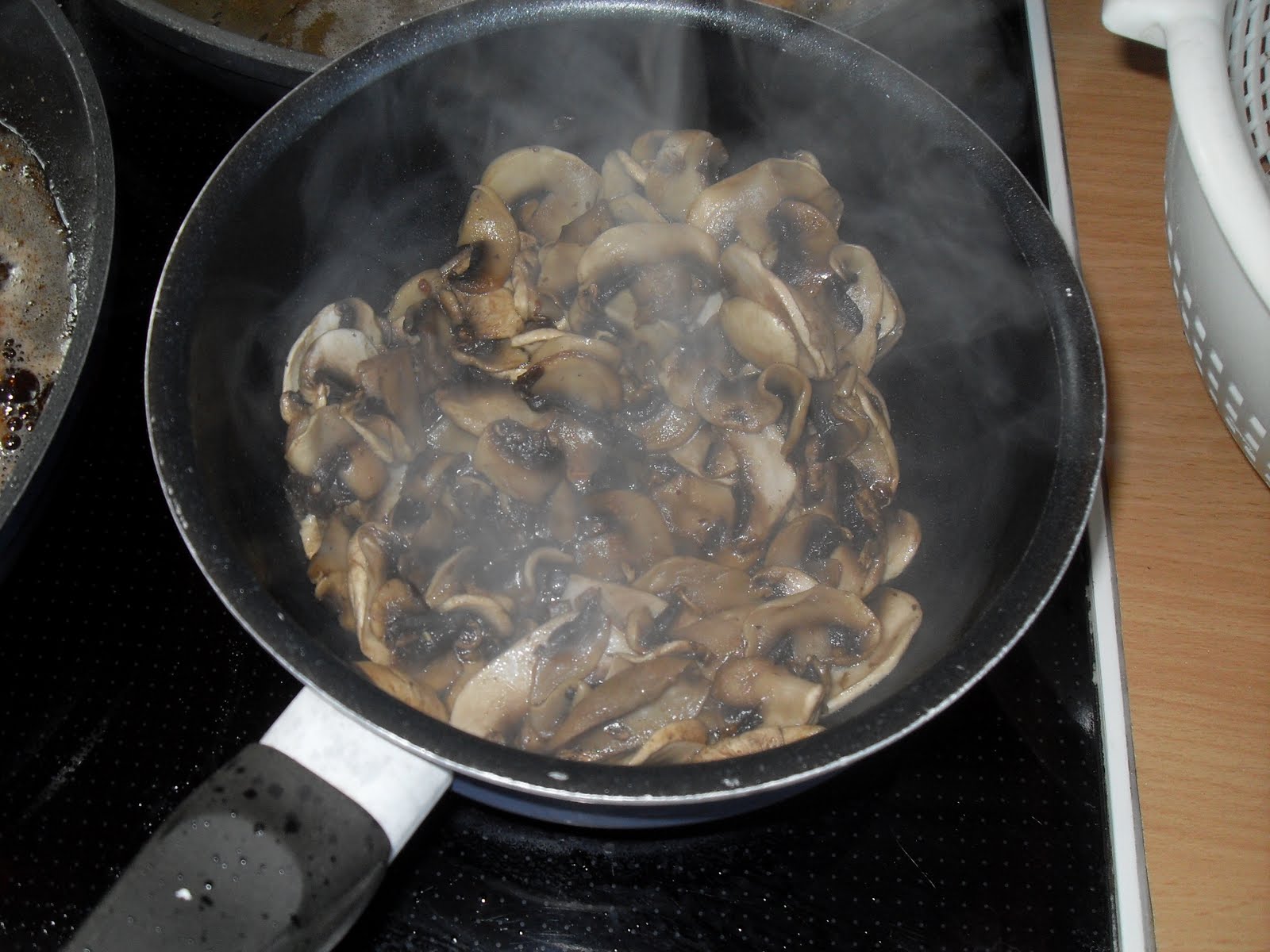 Auf höchster Stufe unter Rühren warten bis die Flüssigkeit verdampft ist, dann die nächsten Champignons hinzu geben. Das macht man so lange, bis alle Champignons im Topf sind. Nun noch die Zwiebeln dazu geben, die Hitze herunterschalten und warten bis die Zwiebeln "weich" sind. Mit Salz und Pfeffer würzen.