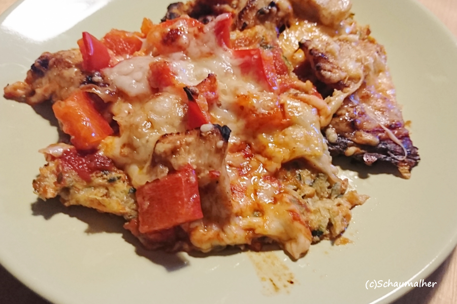 Fazit: Die Konsistenz des Bodens ist natürlich nicht so fest wie wenn er mit Mehl gebacken wurde, aber geschmeckt hat es wirklich lecker und es ist eine super Alternative zur normalen Pizza oder gefüllten Zucchini ;)