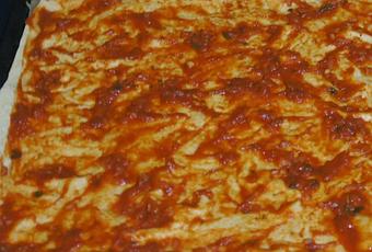 Mit den passierten Tomaten ablöschen und auf zwei Drittel reduzieren lassen. Mit den Gewürzen und dem Zucker abschmecken und auf den ausgerollten >>Pizzateig<< geben.