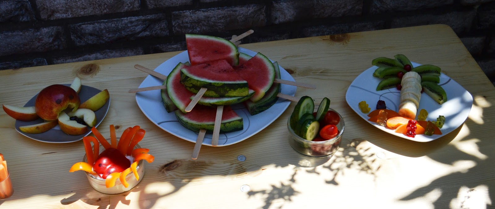 Also mal wieder im Netz nach ein paar Ideen gesucht und umgesetzt. Zunächst war natürlich wichtig, das es einen themenbezogenen Kuchen gibt und mein Sohn hat sich für diesen Strandkuchen entschieden, der nicht nur nett aussieht, sondern auch recht schnell zubereitet ist:Hierfür habe ich mein zusammenschiebbares Backblech verwendet und auf halbe Größe gebracht.Als Teig habe ich mein Lieblingsrezept (für ein ganzes Blech) für Rührteig genommen plus Zitronenaroma - Zitronensaft & Kinder...geht immer ;-)6 Muffinförmchen habe ich mit dem Teig befüllt (die brauchte ich später noch, wie ihr gleich lesen könnt) und den restlichen Teig habe ich auf das Backblech gegeben und gebacken.Nach dem Auskühlen ging es dann schon an das Dekorieren. Hierfür habe ich dann ein halbes Päckchen Puderzucker fein gesiebt und mit etwas Zitronensaft glatt gerührt.Die Muffins wurden dann in einer Schüssel zerkrümelt - ich brauchte ja schließlich Sand :-DFür den Strand wurde dann etwas Zuckerguß ungleichmäßig auf das obere Drittel des Kuchens verteilt.Restlicher Zuckerguß mit blauer Lebensmittelfarbe verrühren und als Meer auftragen. ich möchte mal wieder darauf hinweisen, das man Zuckerguß (farbig) wirklich mit viel Puderzucker anrühren muss, damit er schön dick wird und man ihn auch nur so schön deckend hinbekommt!!Jetzt die Muffinkrümel als Strand auf den hellen Zuckerguß verteilen und vorsichtig etwas festdrücken.Das Ausdekorieren .... da könnt ihr eurer Phantasie freien Lauf lassen :-) Ich hatte Weingummihaie bekommen und diese natürlich verwendet.Weiterhin nahm ich Mutterkekse und habe diese bunt eingefärbt mit bunter Schokolade. Darauf dann einfach ein Gummibärchen gelegt und fertig waren die Strandliegen/Luftmatratzen.Ein paar Gummibärchen durften dann auch im Meer mit einem Ball spielen (bunte Schokonüsse) und auf ihren bunten Luftmatratzen schwimmen :-)Zum Schluß noch ein paar Partyschirmchen und "Palmwedel" eingesteckt und fertig war der Strandkuchen, der übrigens für jede Menge "Wow" und "Cool" gesorgt hat ;-)Als nächstes hatte ich mir überlegt, das leichte Sachen zum Snacken zwischendurch wohl am besten wären, da weder wir Erwachsenen noch die Kinder bei großer Hitze allzu viel Hunger haben.Dafür habe ich dann einfach eine Art Bufett aufgebaut mit "Krabbenbeinen" (Möhren in Stiftform geschnitten und in kleinen Schnapsgläschen gesteckt), "Seegurkenscheiben" (Schlangengurkcn), eine Paprika als Krake angerichtet in einem leichten Joghurtdip (kleine Paprika halbieren und eine Hälfte mit Augen versehen und auf den Dip setzen; andere Hälfte zu Streifen schneiden und rund um den Körper in den Dip stecken, so das die anderen Enden über den Rand hinaus gucken).Ok, Kinder stehen ja doch mehr auf Obst und von daher habe ich überwiegend Obstsnacks zubereitet.Wie ihr oben bereits sehen könnt, wurde natürlich Wassermelone genommen, da diese immer einen tollen Durstlöscher darstellt und wohl von fast jedem Kind gegessen wird. Einfache Stücke oder Würfel...neee, das ist ja langweilig :-) Und schließlich gehört zu einer Poolparty auch Eis!! Also nehme man eine Melone, schneide dicke Scheiben und viertelt (je nach Größe achteln) diese. In die Mitte der Schalen sticht man dann einen Schlitz mit einem spitzen Messer und schiebt einfach Holzspatel (wie man sie von Stieleis kennt - bekommt man in Bastelläden oder online) hinein. Fertig ist das "Meloneneis" :-) Am besten bis zum Servieren kalt stellen!Dann fand ich diese Krabbe im Netz, die ebenfalls einfach und ruckzuck gemacht ist:Apfel halbieren und entkernen. Eine Hälfte in Streifen schneiden (eigentlich 8 Streifen, aber hier wurden schon 2 Beine gemopst :-P ). Bei 2 Streifen mittig kleine Dreiecke ausschneiden - das werden dann die Scheren. 6 Streifen unter den Körper seitlich legen und die beiden scheren vorne unter den Körper legen, Auf die Apfelhälfte 2 Augen aufmalen und fertig ist die Apfelkrabbe!Und dann war da noch die Palme...Sorry, bevor ich beginne den Palmenbau zu beschreiben... Ich habe vor der Zubereitung mit dem Obst eine Schüssel mit Zitronenwasser bereit gestellt zum kurzen Eintauchen der Apfel- und Bananen, damit diese nicht braun werden. Also bei der Zubereitung der Krabbe oben daran denken!!Jetzt aber zur Palme: Eine Kiwi schälen und achteln, Banane schälen und in Scheiben schneiden (durch Zitronenwasser ziehen) und eine Aprikose entkernen und in Streifen schneiden.Ich denke mal, der Rest ergibt sich durch das Foto von alleine :-) Als Kokosnüsse habe ich Johannisberen verwendet und natürlich durften am Strand unten auch noch ein paar Gummibärchen spazieren gehen ;-)Aber jetzt kommen wir zu DEM Highlight des Tages :-D Die Kids waren völlig begeistert und angetan von der Melonen-Obstspieß-Schale mit einem waschechten Delphin :-D Unser Geburtstagskind hat auch immer wieder darauf hingewiesen, das nur ER den Delphin später essen darf :-P