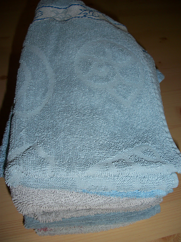 Letzte Woche waren es die weißen Handtücher, diese Woche sind die ausgewaschenen Gästehandtücher dran. Inzwischen sind bei uns neue, viel schönere Handtücher eingezogen und so tut es mir um diese hier nicht leid.