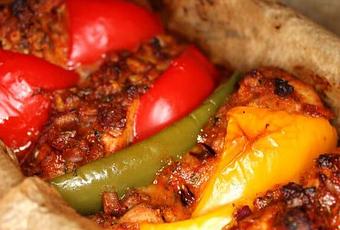 Kastenform 30 cm lang mit Backpapier auslegen und Putenfleisch und Paprikaviertel abwechselnd einschichten.