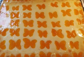 Nach dem Erkalten des Kuchens 2 Päckchen Tortenguss anrühren, (dazu bewahre ich gerne den Saft von weißen Früchten auf Pfirsich, Mandarinen usw., falls ich Dosenfrüchte verwende) und über den Kuchen streichen.