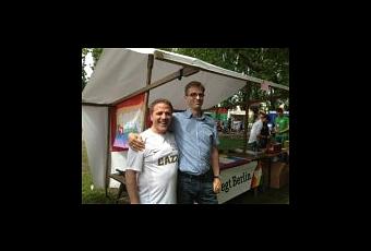 Hakan Tas und Stefan Liebich bei den Respect Gaymes. Sandra BrunnerTrotz durchwachsenem Wetter fanden sich am Sonnabend wieder viele Menschen im Jahn-Sportpark in Prenzlauer Berg bei den Respect Gaymes ein, die unter dem Motto „Zeig Respekt für Lesben und Schwule!“ standen. Die Respect Gaymes gibt es seit 2005 und Politikerinnen und Politiker, unter ihnen auch Stefan Liebich, sowie andere Prominente unterstützen nicht nur hier die Arbeit des LSVD Berlin-Brandenburg e.V. und treten als Respektbotschafter für eine bessere gesellschaftliche Akzeptanz von Schwulen und Lesben ein.