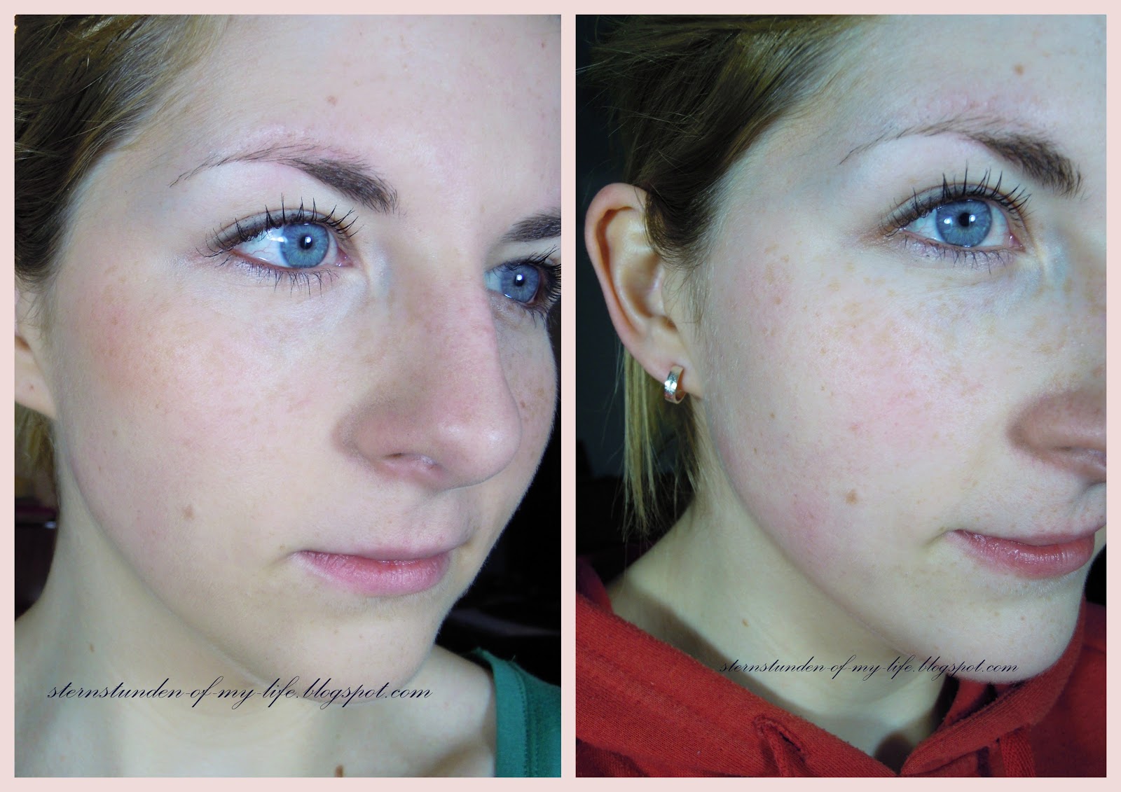 Und nun zum Ergebnis:Auf der linken Seite sehr ihr ein Bild frisch am Morgen nach dem Schminken. Das Fluid lässt sich sehr einfach verteilen und man muss auch nicht ewig warten, bis es eingezogen ist. Man kann sofort mit dem Makeup weiterarbeiten. Man sieht deutlich, dass mein gesamtes Gesicht abmattiert ist, aber meine (eigentlich) trockenen Stellen so mit Feuchtigkeit versorgt sind, dass nichts schuppt.Auf dem rechten Bild seht ihr mich nach einem abgekämpften, stürmischen Tag nach der Arbeit. Stürmisch im wahrsten Sinne des Wortes, da ich an diesem Tag wirklich NUR draußen mit den Kindern unterwegs war. Man sieht, dass der Concealer sich verflüchtigt hat, und auch die Rötungen an Wangen und Nase sind deutlich- aber, wie gesagt, es war ein harter Tag. Was man aber auch sieht: kein Glanz! Und das macht mich sehr happy, da ich sonst mit meiner T-Zone etwas zu kämpfen habe.