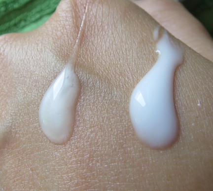 Konsistenz: hier links im Bild das Shampoo und rechts der Conditioner. Beide Produkte sind schön cremig um es toll im Haar verteilen zu können. Es tropft nichts. Das Shampoo schäumt leicht aber vollkommen ausreichend!