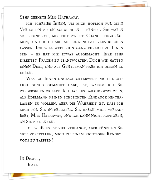 Leanne Hathaway ist als leidenschaftliche Autorin immer auf der Suche nach spannenden Geschichten. In ihrem nächsten historischen Roman soll es um die sagenumwobene Familiengeschichte des schottischen Grafen Blake Kilchurn gehen, die ein großes Geheimnis birgt. Doch als der gutaussehende Erbe sie tatsächlich im Kilchurn Castle empfängt, um ihre Fragen zu beantworten, benimmt dieser sich absolut unverschämt. Nicht nur, dass er Leanne mit fadenscheinigen Antworten abspeist, er befiehlt ihr doch tatsächlich ihm zu gehorchen! Nach diesem miserablen ersten Treffen versucht Leanne bereits, den Grafen zu vergessen, als dieser sie plötzlich zu einem Dinner einlädt, um den misslungenen ersten Eindruck wieder wett zu machen. Aber was will der Graf wirklich von ihr?