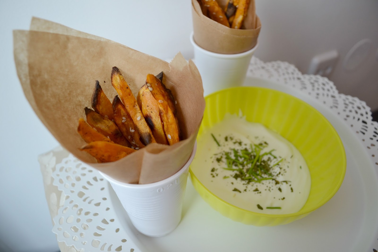 Die Süßkartoffeln sind auch gut geeignet als Snacks für Parties! Ich liebe die Kombi: Süßkartoffeln und Knoblauch-Joghurt.