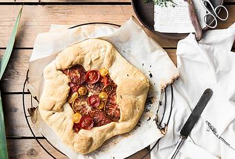 - Nun das restliche Mehl in den Teig kneten, auf einer bemehlen Oberfläche ausrollen und mit den, in Scheiben geschnittenen Tomaten belegen.