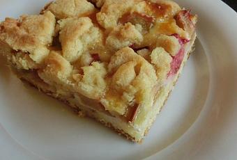 Aus Butter, Zucker, Eigelb, Zimt und Mehl Streusel bereiten und auf dem Kuchen verteilen.