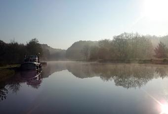 Der Kanal kurvt ganz lieblich durch die Hügellandschaft. Aber alle ein, zwei Kilometer unterbricht eine Schleuse unsere Fahrt. Es geht jedes Mal etwa zweieinhalb Meter hinunter. Die Schleusen schalten wir mit einer Fernbedienung. Die Bedienung ist recht übersichtlich, denn das Gerät hat nur eine einzige grüne Taste. Drauf drücken – und die Schleusen fährt mit uns hinunter. Oder hinauf, je nachdem in welcher Richtung man unterwegs ist.