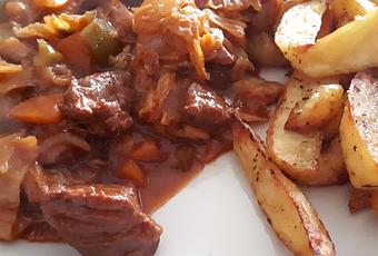 - Bouillon dazugiessen, aufkochen, zugedeckt bei kleiner Hitze ca. 2 Std. schmoren. Deckel entfernen, Flüssigkeit ca. 10 Min. etwas einköcheln, würzen.