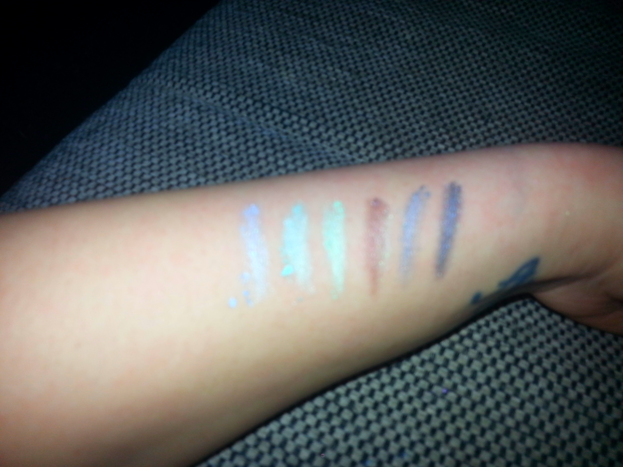 Da wollte ich auch gleich mal Swatches zeigen ;) Das obere sind die ersten 6 Farben. von weiß, über rosa bis zu einem dunklen Blau. Unten auf dem Bild habt ihr die letzten 6 dieser Palette von einem hellblau über grün bis hin zu grau und schwarz. Alle Farben sind sehr gut deckend und auch wieder zu erkennen :) Ich bin sehr gespannt welche Augen Make-ups ich damit zaubern kann.Wenn ihr Vorschläge habt dann schreibt mir. Ich werde mich morgen an einem versuchen ;)
