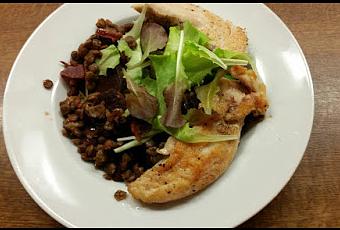 - den Rote-Bete-Linsensalat zusammen mit den Hähnchenfilets auf Tellern anrichten und mit der garnieren.