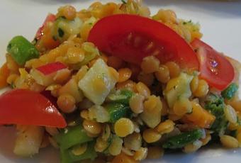 Hier noch die Beilage zu unserem gebratenen Filet vom schwarzen Heilbutt, ein frischer und knackiger Salat aus roten Linsen.