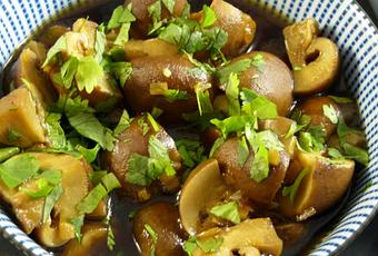 Etwas Öl in einem Wock erhitzen. Knoblauch, Schalotten, Ingwer, Chili und Korianerwurzeln ca. 2 min unter Rühren anbraten. Pilze zugeben, soviel Schmorsud angießen, dass sie knapp bedeckt sind und 20 min schmurgeln lassen.