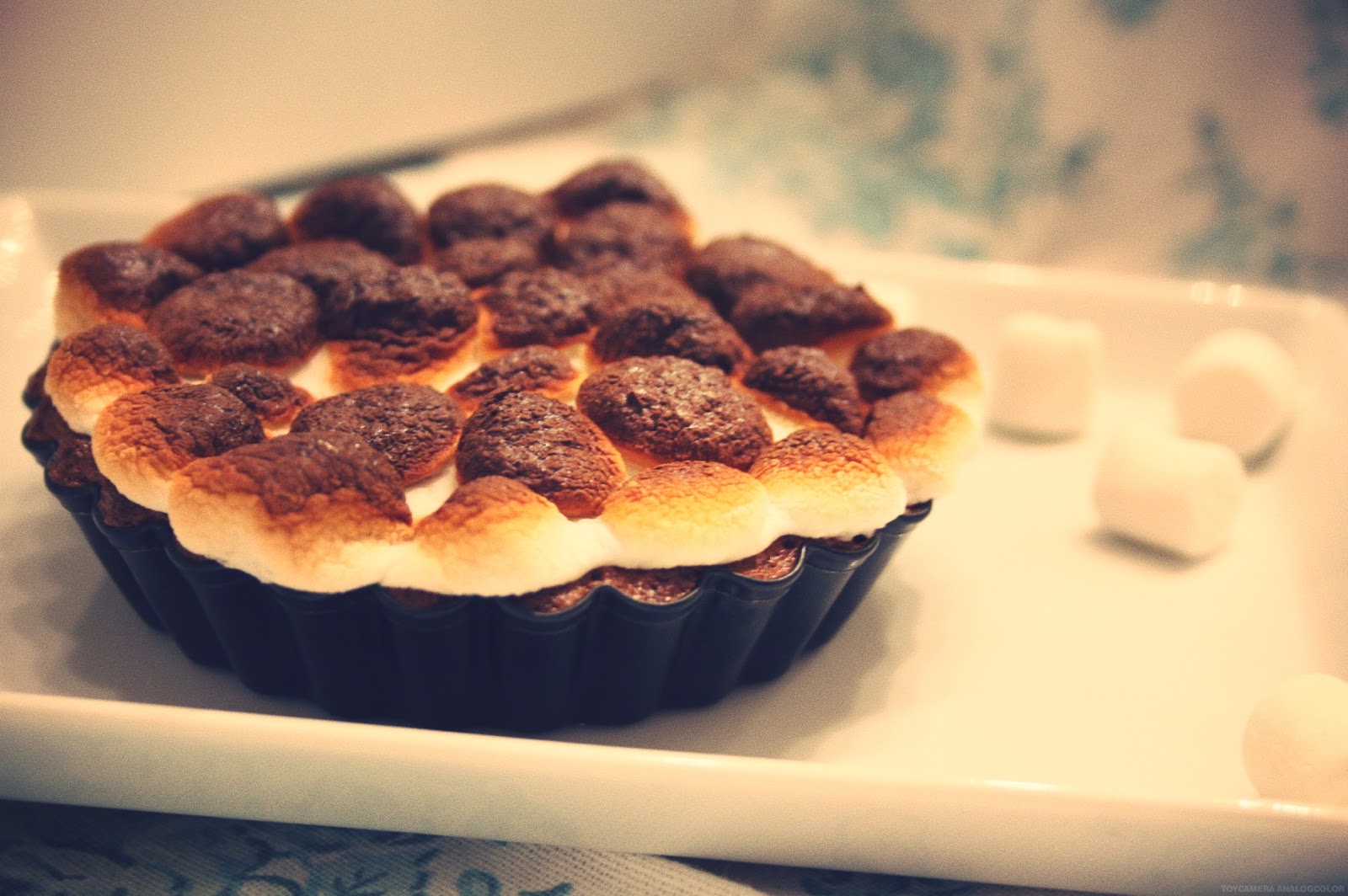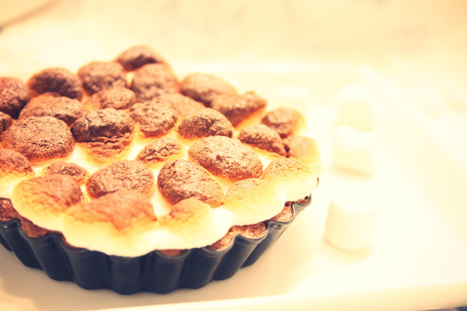S'more BarsFür eine große Tarteform braucht ihr:1,5 Tassen Graham crackers (ich habe als alternative eine Packung Leibnitz Vollkornkekse genommen- tat dem Ganzen keinen Abbruch)8 TL +/- Butter200g Vollmilchschokolade in Stücke200g Sahne1 EiPrise Salz1 Tüte Marshmallow (empfohlen sind minis, es gehen aber auch alle anderen)Und so geht’s:Für den Krümelboden Kekse in der Küchenmaschine klein bröseln lassen. Alternativ in einen Folienbeutel packen und mit dem Wellholz bearbeiten. Die Butter in einem Topf erwärmen bis sie flüssig ist (!!! Sie darf nicht blubbern) und zu den Bröseln geben. Gut vermengen, bis das Ganze etwa die Textur von nassem Sand hat. Das Ganze nun in die Tarteform (mit Backpapier ausgelegt) geben, festdrücken und etwa 30 Minuten auskühlen & festwerden lassen. Das ist wichtig damit der Boden später nicht bricht. Heizt den Backofen auf 175 Grad Umluft vor.Gebt nun die Sahne in einen Topf und erwärmt diese ebenfalls. Die Schokolade in Stückchen in eine Schüssel geben und die heiße Sahne drüber gießen. Etwa eine Minute stehen lassen, dann rühren bis alles aufgelöst ist. Gebt die Prise Salz und das Ei (!!! Die Schokosahne darf nicht mehr so heiß sein, dass das Ei stockt. Seid ihr euch unsicher- lieber noch kurz abkühlen lassen) hinzu und mixt das Ganze eine dickliche Masse ergibt.Gebt das nun auf den Bröselboden, streicht es glatt und gebt es ca. 25 Minuten in den vorgeheizten Ofen.Kuchen komplett auskühlen lassen.Nun kommt der etwas heikle Teil. Schaltet die Grillfunktion eures Ofens an.Belegt euren Kuchen dicht an dicht mit Marshmallows und gebt ihn in den heißen Ofen (das dauert jetzt keine 2 Minuten).Bleibt bitte bitte dabei und schaut in den Ofen. Die Marshmallows verbrennen ratzifatzi und stinken & qualmen und die ganze Mühe war für die Katz. Also bleibt dabei!!!