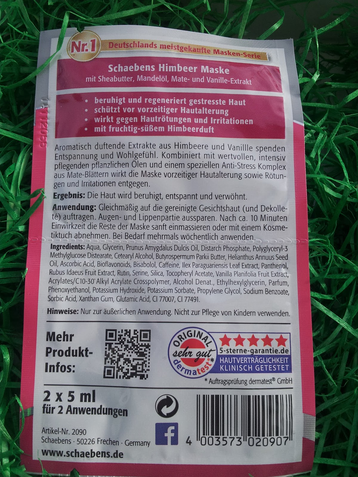 Mein Fazit:Diese Maske ist für mich was ganz besonderes, ich bin wunschlos glücklich mit ihr und total begeistert! Sie besteht eher aus Gel als aus einer Creme, das ist für mich sehr gut, da ich immer Probleme habe mit normalen Cremes. Durch zuviel Streckstoffe akzeptiert meine Haut die Masken & Cremes nicht, die ist hier anscheinend nicht der Fall. Der Duft ist himmlisch, es riecht intensiv nach Himbeeren was für mich Top ist. Dieser Duft erinnert mich an eine Creme von Bübchen, diese riecht genauso. Die Maske ist sehr sanft und für meine Haut bestens geeignet. Da ich unter starken Hautrötungen leide habe ich diesen Effekt besonders gut wahrnehmen können. Nach dem ich die Reste der Maske, die sehr schnell einzog, mit einem Tuch entfernt habe hat weder was gebrannt noch gejuckt. Das ist für mich ein gutes Zeichen das die Maske perfekt für meine Haut geeignet ist. Auch die Farbe der Maske finde ich sehr reizend, ein leichter Rosaton. Von Vanille rieche ich an dieser Maske überhaupt nichts was mich ein wenig verwundert hat. Für mich ist die Maske ein schöner Anreiz in Frühjahrsstimmung zu kommen.Die Maske ist sehr ergibig, ich habe noch ein wenig übrig gehabt von den 5 ml und wusste schon gar nicht mehr wohin ich sie noch auftragen soll. Außerdem kann man die Maske mehrmals die Woche auftragen. Mit dem Preis von den Masken bin ich immer zufrieden.