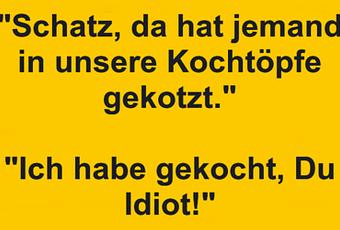 Auf Facebook teilen Vorige Folgende "Schatz, da hat jemand in unsere Kochtöpfe... Autor des Artikels : istdaslustig Zum Original-Artikel "Schatz, da hat jemand in unsere Kochtöpfe gekotzt." "Ich habe gekocht, Du Idiot!" Hier geht es zum Artikel Mehr Lustiges auf www.istdaslustig.de Auf Facebook teilen Vorige Folgende Das könnte Ihnen gefallen Mehr