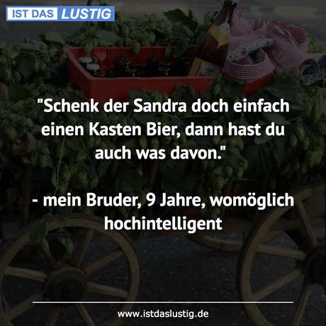 Auf Facebook teilen Vorige Folgende "Schenk der Sandra doch einfach einen Kasten... Autor des Artikels : istdaslustig Zum Original-Artikel "Schenk der Sandra doch einfach einen Kasten Bier, dann hast du auch was davon." - mein Bruder, 9 Jahre, womöglich hochintelligent Hier geht es zum Artikel Mehr Lustiges auf www.istdaslustig.de Auf Facebook teilen Vorige Folgende Das könnte Ihnen gefallen Mehr