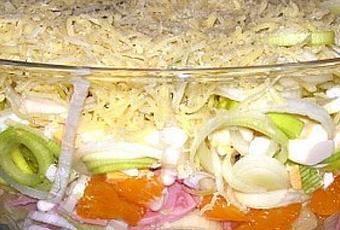 - Selleriestreifen – Äpfel – Mais – 1/3 Miracel Whip drüber streichen – 1/3 Porree – Ananas – Schinken – Mandarinen – 1/3 Miracel Whip drüber streichen – 1/3 Porree – Eier – 1/3 Miracel Whip drüber streichen – 1/3 Porree – geriebenen Käse