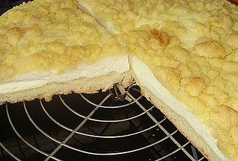Das Backblech mit Fett bestreichen, den Hefeteig ausrollen und auf das Blech legen. Den Rand etwas hochdrücken. Die Quarkmasse darauf verteilen, anschließend die Streusel darüber verteilen.