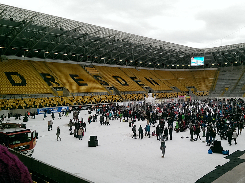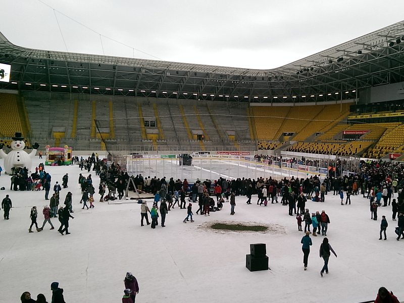 Mittags hieß es dann Mama-Tochter-Zeit mit der Großen. Während der Papa mit der Kleinen Mittag machte, waren die Große und ich mit einer ihrer Freundinnen zum Schlittschuh laufen verabredet.Das besondere, die Eislaufbahn befand sich im Dynamo Stadion, ein Fußball Stadion. Am Vortag fand da ein Eishockey Derby statt und die das Eisfeld wurde am Sonntag der normalen Bevölkerung freigegeben. 2 Sachen hatte ich nicht bedacht. Erstens es gab keinen Eintritt, das bedeutet jeder konnte dahin und zweitens besitzen wir keine eigenen Schlittschuhe und ich wusste nicht ob man da welche ausleihen konnte.