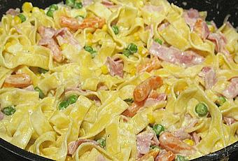 Nudeln nach Packungsvorschrift garen, nicht ganz abtropfen lassen.