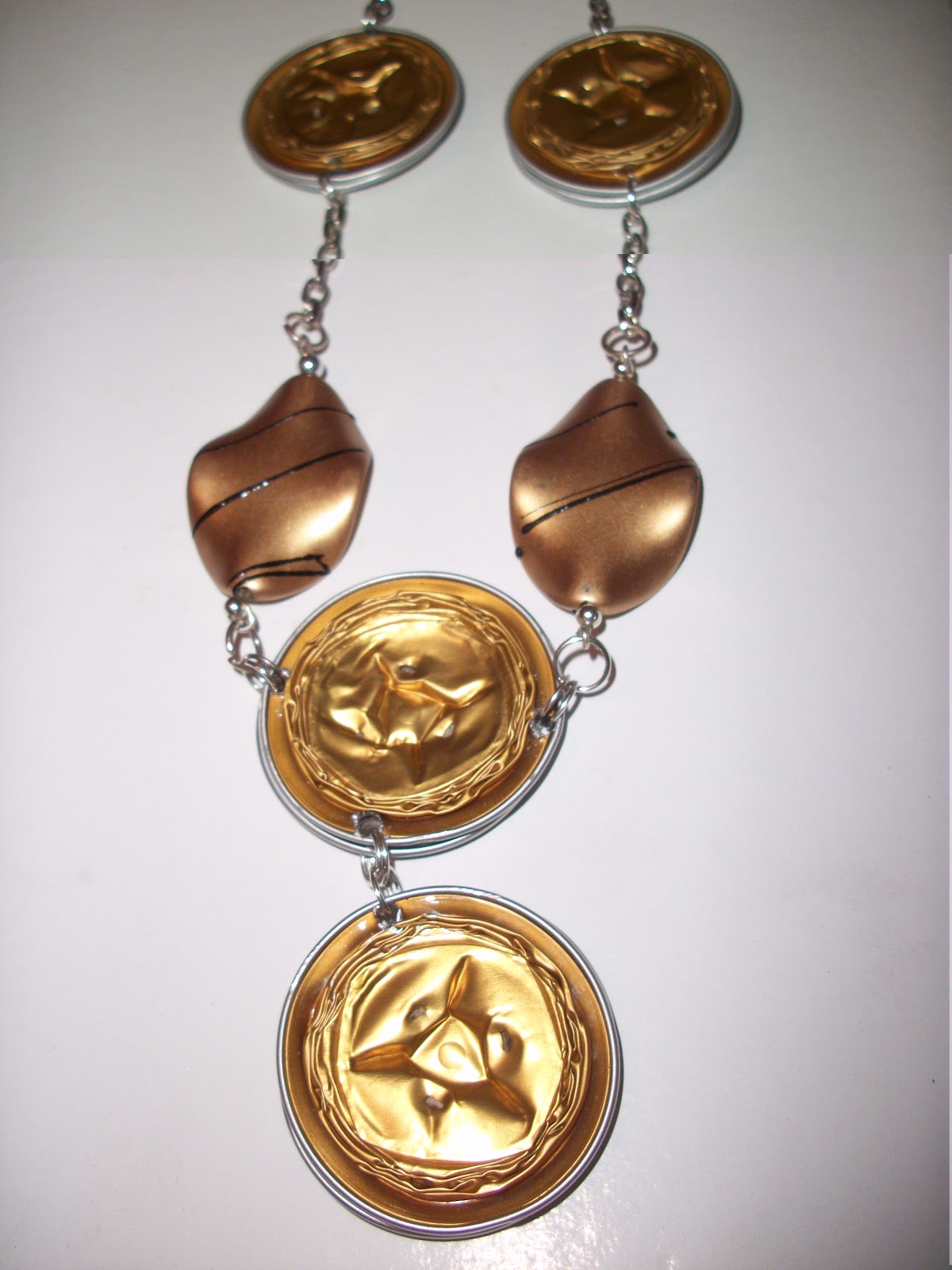 Für die Schmuckherstellung kann man neben den Nespresso-Kapseln verschiedene Materialien verwenden, wie z.B. Perlen, Halbedelsteinen und vieles mehr. Eurer Kreativität sind keine Grenzen gesetzt! Weiters ist jedes Schmuckstück ist ein Unikat.Ich selber habe auch drei Prachtstücke, welche ich auch gerne ausführe :) Ich werde auch immer auf die Ketten angesprochen, weil die Ketten einfach sehr interessant sind!Hier findet ihr eine Anleitung. Wie gefallen euch die Nespresso-Ketten? Bastelt ihr selbst welche?